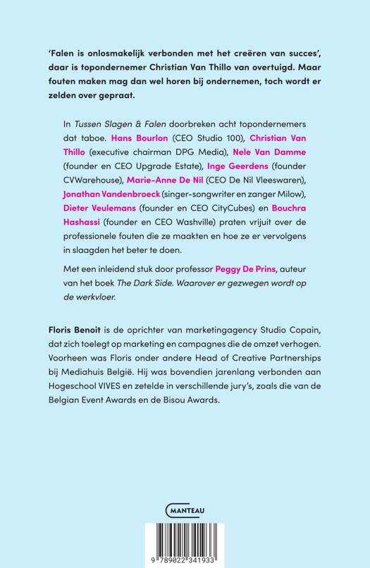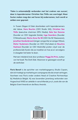 In Tussen Slagen & Falen doorbreken acht topondernemers dat taboe. Hans Bourlon (CEO Studio 100), Christian Van Thillo (executive chairman DPG Media), Nele Van Damme (founder en CEO Upgrade Estate), Inge Geerdens (founder CVWarehouse), Marie-Anne De Nil (CEO De Nil Vleeswaren), Jonathan Vandenbroeck (singer-songwriter en zanger Milow), Dieter Veulemans (founder en CEO CityCubes) en Bouchra Hashassi (founder en CEO Washville) praten vrijuit over de professionele fouten die ze maakten en hoe ze er vervolgens in slaagden het beter te doen. Met een inleidend stuk door professor Peggy De Prins, auteur van het boek The Dark Side. Waarover er gezwegen wordt op de werkvloer.