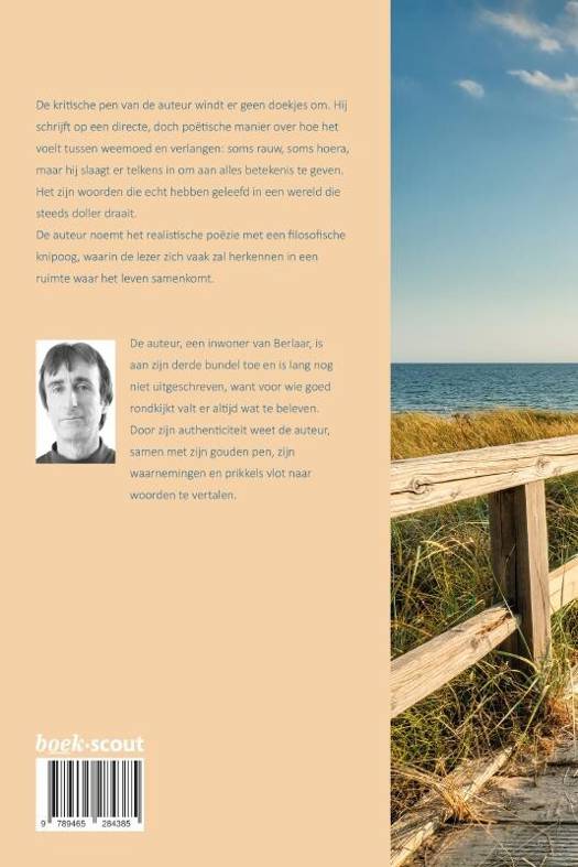 De kritische pen van de auteur windt er geen doekjes om. Hij schrijft op een directe, doch poëtische manier over hoe het voelt tussen weemoed en verlangen: soms rauw, soms hoera, maar hij slaagt er telkens in om aan alles betekenis te geven. Het zijn woorden die echt hebben geleefd in een wereld die steeds doller draait. De auteur noemt het realistische poëzie met een filosofische knipoog, waarin de lezer zich vaak zal herkennen in een ruimte waar het leven samenkomt.
