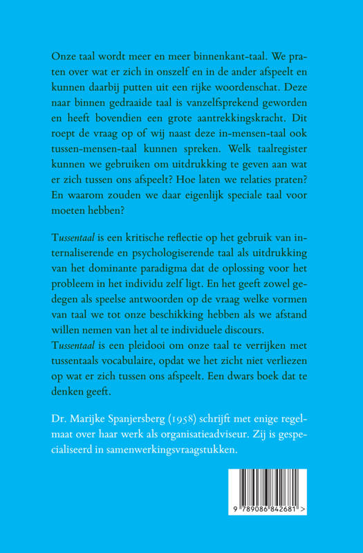 Tussentaal is een kritische reflectie op het gebruik van internaliserende en psychologiserende taal als uitdrukking van het dominante paradigma dat de oplossing voor het probleem in het individu zelf ligt. En het geeft zowel gedegen als speelse antwoorden op de vraag welke vormen van taal we tot onze beschikking hebben als we afstand willen nemen van het al te individuele discours. Tussentaal is een pleidooi om onze taal te verrijken met tussentaals vocabulaire, opdat we het zicht niet verliezen op wat er zich tussen ons afspeelt. Een dwars boek dat te denken geeft.