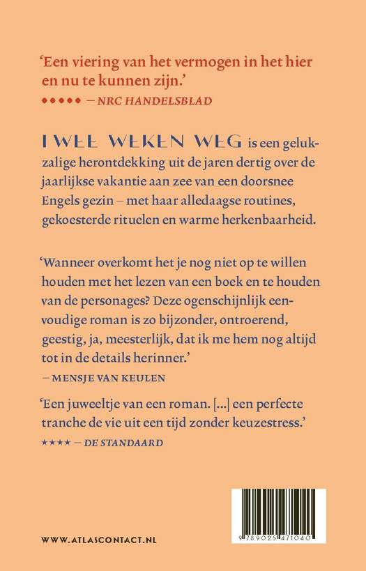‘Twee weken weg’ van R.C. Sherriff is een gelukzalige herontdekking uit de jaren dertig over de jaarlijkse vakantie aan zee van een doorsnee Engels gezin – met haar alledaagse routines, gekoesterde rituelen en warme herkenbaarheid. Al twintig jaar reist het gezin Stevens begin september vanuit hun Londense voorstad naar dezelfde vakantiebestemming: Bognor Regis, een badplaats ten zuidwesten van Londen. De dagen versmelten, de gedachte aan het einde van de vakantie wordt resoluut verdrongen. De kinderen knopen kortstondige vriendschappen aan, de oudste dochter beleeft haar eerste zomerliefde. Ondertussen probeert de vader zich op te laden voor de sleur die hem de komende vijftig weken wacht, en doet de moeder braaf alsof ook zij geniet van hun jaarlijkse uitspatting.