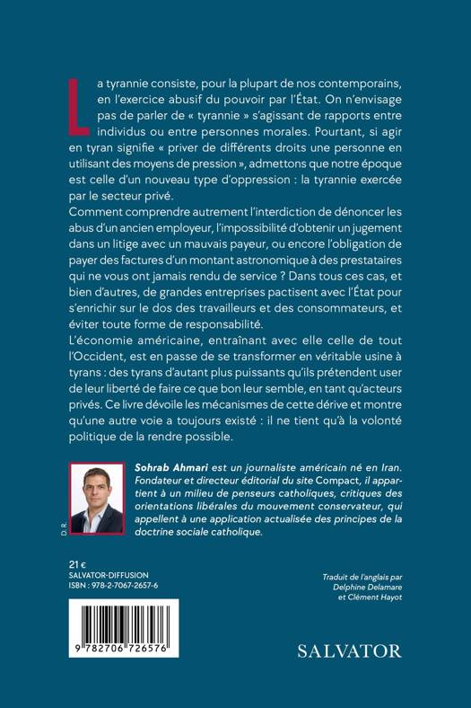 La tyrannie consiste, pour la plupart de nos contemporains, en l'exercice abusif du pouvoir par l'État. On n'envisage pas de parler de « tyrannie » s'agissant de rapports entre individus ou entre personnes morales. Pourtant, si agir en tyran signifie « priver de différents droits une personne en utilisant des moyens de pression », admettons que notre époque est celle d'un nouveau type d'oppression : la tyrannie exercée par le secteur privé. Comment comprendre autrement l'interdiction de dénoncer les abus d'un ancien employeur, l'impossibilité d'obtenir un jugement dans un litige avec un mauvais payeur, ou encore l'obligation de payer des factures d'un montant astronomique à des prestataires qui ne vous ont jamais rendu de service ? Dans tous ces cas, et bien d'autres, de grandes entreprises pactisent avec l'État pour s'enrichir sur le dos des travailleurs et des consommateurs, et éviter toute forme de responsabilité. L'économie américaine, entraînant avec elle celle de tout l'Occident, est en passe de se transformer en véritable usine à tyrans : des tyrans d'autant plus puissants qu'ils prétendent user de leur liberté de faire ce que bon leur semble, en tant qu'acteurs privés. Ce livre dévoile les mécanismes de cette dérive et montre qu'une autre voie a toujours existé : il ne tient qu'à la volonté politique de la rendre possible. Traduit de l'anglais par Delphine Delamare et Clément Hayot AUTEUR Sohrab Ahmari est un journaliste américain né en Iran. Fondateur et directeur éditorial du site Compact, il appartient à un milieu de penseurs catholiques, critiques des orientations libérales du mouvement conservateur, qui appellent à une application actualisée des principes de la doctrine sociale catholique.