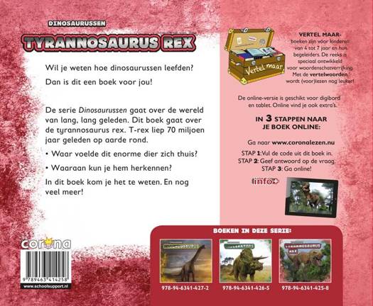 Wil je weten hoe dinosaurussen leefden? Dan is dit een boek voor jou! De serie Dinosaurussen gaat over de wereld van lang, lang geleden. Dit boek gaat over de tyrannosaurus rex. T-rex liep 70 miljoen jaar geleden op aarde rond. • Waar voelde dit enorme dier zich thuis? • Waaraan kun je hem herkennen? In dit boek kom je het te weten. En nog veel meer!