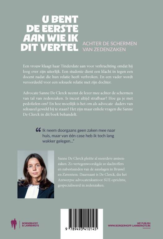 Advocate Sanne De Clerck neemt de lezer mee achter de schermen van tal van zedenzaken. Is incest altijd strafbaar? Hoe ga je met pedofielen om? En hoe moeilijk is het om als advocate daders van seksueel geweld bij te staan? Het zijn maar enkele vragen die Sanne De Clerck in dit boek behandelt.