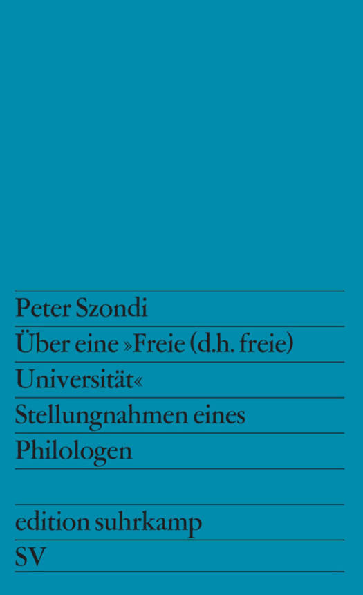 Peter Szondi war bis zu seinem Tode im Oktober 1971 Ordinarius der Allgemeinen und Vergleichenden Literaturwissenschaft an der Freien Universität Berlin. Er hat in den Jahren 1965 bis 1971 wiederholt zu Problemen der Hochschulpolitik Stellung genommen. Seine entschiedenen Kommentare, seine Parteinahme für Veränderungen des Ausbildungssystems und für die Demokratisierung der Schulen und Hochschulen hat ihn frühzeitig zu einem der wichtigen Sprecher der Reformbewegung an der Freien Universität Berlin werden lassen. Die Vorschläge, die er gemacht hat, die Kritik an der Ordinarienuniversität alten Stils, die er als einer der ersten Professoren seines Fachs formuliert hat, zeigen den bedeutenden Gelehrten als politisch engagierten Verfechter eines gewandelten Selbstverständnisses der Universität. Peter Szondis Arbeiten zu diesem Thema versammelt unser Band.