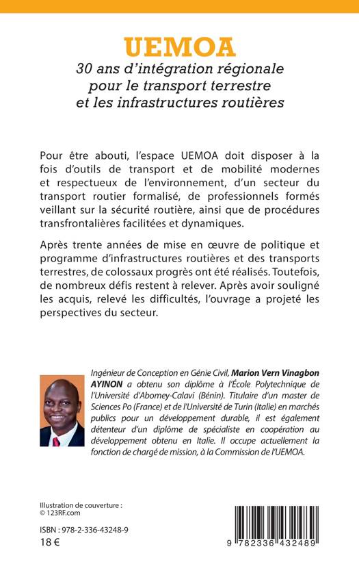 Pour être abouti, l'espace UEMOA doit disposer à la fois d'outils de transport et de mobilité modernes et respectueux de l'environnement, d'un secteur du transport routier formalisé, de professionnels formés veillant sur la sécurité routière, ainsi que de procédures transfrontalières facilitées et dynamiques. Après trente années de mise en oeuvre de politique et programme d'infrastructures routières et des transports terrestres, de colossaux progrès ont été réalisés. Toutefois, de nombreux défis restent à relever. Après avoir souligné les acquis, relevé les difficultés, l'ouvrage a projeté les perspectives du secteur.