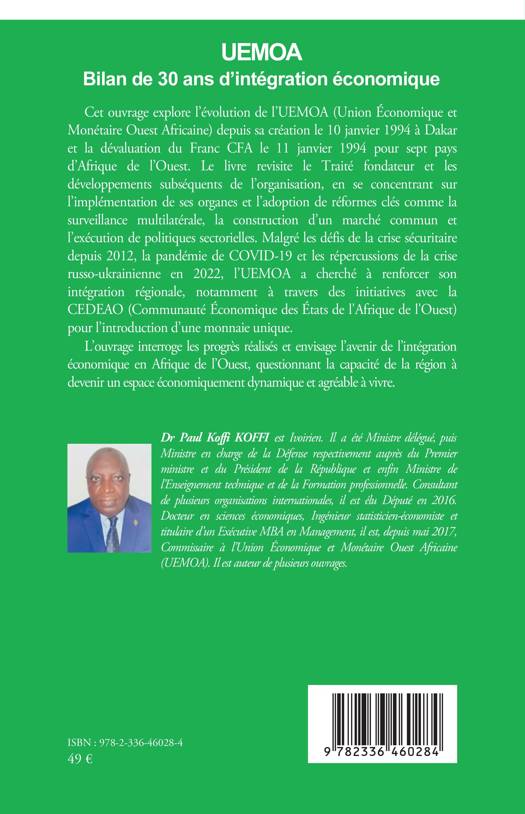 Cet ouvrage explore l’évolution de l’UEMOA (Union Économique et Monétaire Ouest Africaine) depuis sa création le 10 janvier 1994 à Dakar et la dévaluation du Franc CFA le 11 janvier 1994 pour sept pays d’Afrique de l’Ouest. Le livre revisite le Traité fondateur et les développements subséquents de l’organisation, en se concentrant sur l’implémentation de ses organes et l’adoption de réformes clés comme la surveillance multilatérale, la construction d’un marché commun et l’exécution de politiques sectorielles. Malgré les défi s de la crise sécuritaire depuis 2012, la pandémie de COVID-19, et les répercussions de la crise russo-ukrainienne en 2022, l’UEMOA a cherché à renforcer son intégration régionale, notamment à travers des initiatives avec la CEDEAO (Communauté Économique des États de l'Afrique de l'Ouest) pour l’introduction d’une monnaie unique. L’ouvrage interroge les progrès réalisés et envisage l’avenir de l’intégration économique en Afrique de l’Ouest, questionnant la capacité de la région à devenir un espace économiquement dynamique et agréable à vivre.