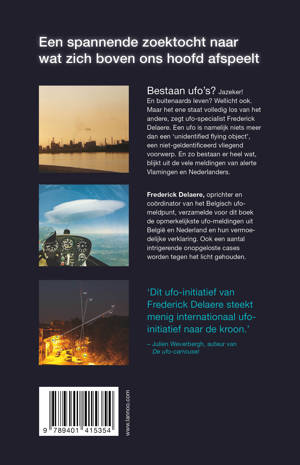 Een spannende zoektocht naar wat zich boven ons hoofd afspeelt Bestaan ufo's? Jazeker! En buitenaards leven? Wellicht ook. Maar het ene staat volledig los van het andere, zegt ufo-specialist Frederick Delaere. Een ufo is namelijk niets meer dan een 'unidentified flying object', een niet-geïdentificeerd vliegend voorwerp. En zo bestaan er heel wat, blijkt uit de vele meldingen van alerte Vlamingen en Nederlanders. Frederick Delaere, oprichter en coördinator van het Belgisch ufomeldpunt, verzamelde voor dit boek de opmerkelijkste ufo-meldingen uit België en Nederland en hun vermoedelijke verklaring. Ook een aantal intrigerende onopgeloste cases worden tegen het licht gehouden.