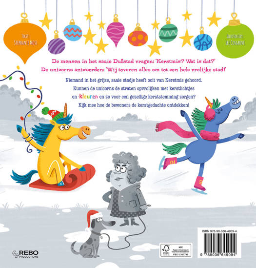 De mensen in het saaie Dufstad vragen: ‘Kerstmis? Wat is dat?’ De unicorns antwoorden: ‘Wij toveren alles om tot een hele vrolijke stad!’ Niemand in het grijze, saaie stadje heeft ooit van Kerstmis gehoord. Kunnen de unicorns de straten opvrolijken met kerstlichtjes en -kleuren en zo voor een gezellige kerststemming zorgen? Kijk mee hoe de bewoners de kerstgedachte ontdekken!