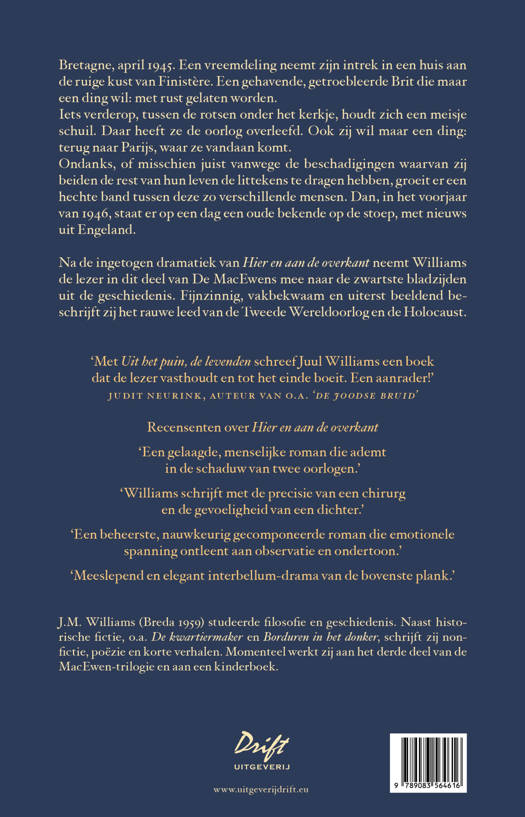Bretagne, april 1945 Een vreemdeling neemt zijn intrek in een huis aan de ruige kust van Finistère. Een gehavende, getroebleerde Brit die maar een ding wil: met rust gelaten worden. Iets verderop, tussen de rotsen onder het kerkje, houdt zich een meisje schuil. Daar heeft ze de oorlog overleefd. Ook zij wil maar een ding: terug naar Parijs, waar ze vandaan komt. Ondanks, of misschien juist vanwege de beschadigingen waarvan zij beiden de rest van hun leven de littekens te dragen hebben, groeit er een hechte band tussen deze twee zo verschillende mensen. Dan, in het voorjaar van 1946, staat er op een dag een oude bekende op de stoep, met nieuws uit Engeland. Na de ingetogen dramatiek van Hier en aan de overkant neemt Williams de lezer in dit deel van De MacEwens mee naar de zwartste bladzijden uit de geschiedenis. Fijnzinnig, vakbekwaam en uiterst beeldend beschrijft zij het rauwe leed van de Tweede Wereldoorlog en de Holocaust. ‘Met Uit het puin, de levenden schreef Juul Williams een boek dat de lezer vasthoudt en tot het einde boeit. Een aanrader!’ Judit Neurink, auteur van o.a. ‘De Joodse bruid’ Recensenten over Hier en aan de overkant ‘Een gelaagde, menselijke roman die ademt in de schaduw van twee oorlogen.’ ‘Williams schrijft met de precisie van een chirurg en de gevoeligheid van een dichter.’ ‘Een beheerste, nauwkeurig gecomponeerde roman die emotionele spanning ontleent aan observatie en ondertoon.’ ‘Meeslepend en elegant interbellum-drama van de bovenste plank.’ J.M. Williams (Breda 1959) studeerde filosofie en geschiedenis. Naast historische fictie, o.a. De kwartiermaker en Borduren in het donker, schrijft zij non-fictie, poëzie en korte verhalen. Momenteel werkt zij aan het derde deel van de MacEwen-trilogie en aan een kinderboek