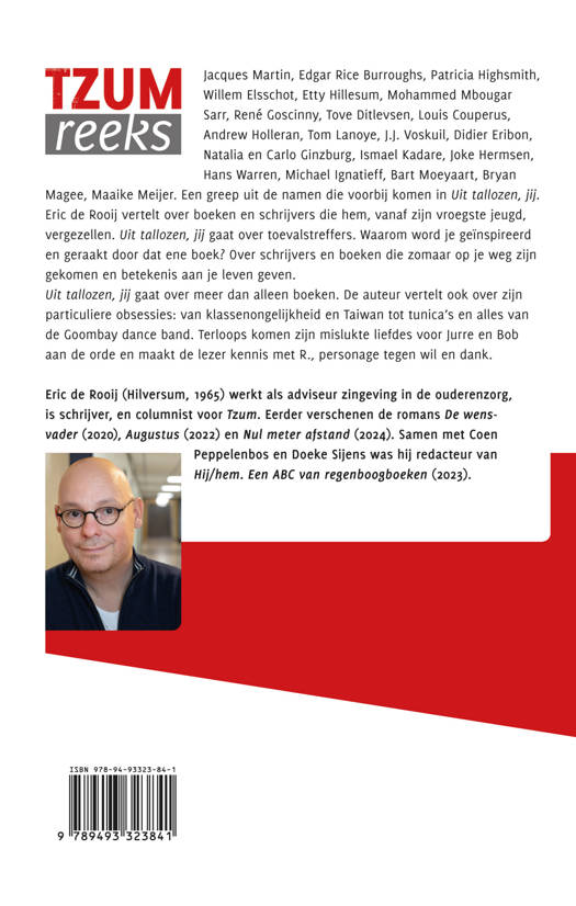 Eric de Rooij vertelt over boeken en schrijvers die hem, vanaf zijn vroegste jeugd, vergezellen. Uit tallozen, jij gaat over toevalstreffers. Waarom word je geïnspireerd en geraakt door dat ene boek? Over schrijvers en boeken die zomaar op je weg zijn gekomen en betekenis aan je leven geven.