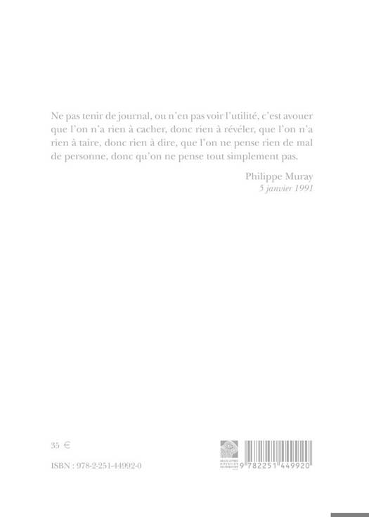 Ne pas tenir de journal, ou n'en pas voir l'utilite, c'est avouer que l'on n'a rien a cacher, donc rien a reveler, que l'on n'a rien a taire, donc rien a dire, que l'on ne pense rien de mal de personne, donc qu'on ne pense tout simplement pas.Philippe Muray5 janvier 1991