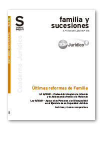En el ámbito de Infancia, Familia y Capacidad abordamos en este Cuaderno dos reformas legales muy destacadas, que introducen importantes modificaciones en nuestro ordenamiento jurídico. En primer lugar, la Ley Orgánica 8/2021, de 4 de junio, de Protección Integral a la Infancia y la Adolescencia frente a la Violencia (en vigor desde el 25 de junio de 2021), y, en segundo, la Ley 8/2021, de 2 de junio, por la que se reforma la Legislación Civil y Procesal para el Apoyo a las Personas con Discapacidad en el Ejercicio de su Capacidad Jurídica (en vigor desde el 3 de septiembre de 2021). Para su conocimiento los artículos doctrinales que se incluyen en esta edición especial han sido elaborados por expertos juristas especializados en cada una de ellas. La magistrada EMELINA SANTANA PÁEZ nos da una visión global de la Ley Orgánica 8/2021, destacando las principales modificaciones que afectan al ámbito del Derecho de Familia. Por su parte, la catedrática de Derecho civil y Vocal Permanente de la Sección Primera de la Comisión General de Codificación M.ª PAZ GARCÍA RUBIO nos desvela con suma claridad los puntos principales y las líneas básicas de una reforma introducida por la Ley 8/2021. También incorporamos algunos cuadros comparativos de las normas sustantivas que resultan afectadas.