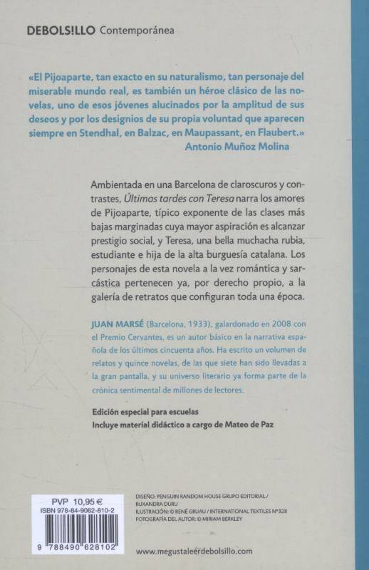 AMBIENTADA EN una Barcelona de claroscuros y contrastes, Últimas tardes con Teresa narra los amores de Pijoaparte, típico exponente de las clases más bajas marginadas cuya mayor aspiración es alcanzar prestigio social, y Teresa, una bella muchacha rubia, estudiante e hija de la alta burguesía catalana. Los personajes de esta novela a la vez romántica y sarcástica pertenecen ya, por derecho propio, a la galería de retratos que coniguran toda una época. Hito de la literatura española contemporánea, esta obra consolidó internacionalmente el nombre de su autor. ENGLISH DESCRIPTION Set in a Barcelona full of contrasts, Last Afternoons with Teresa tells of the loves of Pijoaparte, a typical working-class girl whose highest aspiration is to reach social prestige, and Teresa, a beautiful blonde daughter of the Catalán bourgeoisie. The characters in this novel, at once romantic and sarcastic, already belong to the gallery of portraits that shape an era. A landmark in contemporary Spanish literature, this work established its author's name around the world.