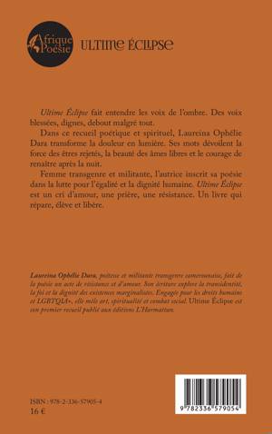 Ultime Éclipse fait entendre les voix de l'ombre. Des voix blessées, dignes, debout malgré tout. Dans ce recueil poétique et spirituel, Laureina Ophélie Dara transforme la douleur en lumière. Ses mots dévoilent la force des êtres rejetés, la beauté des âmes libres et le courage de renaître après la nuit.Femme transgenre et militante, l'autrice inscrit sa poésie dans la lutte pour l'égalité et la dignité humaine. Ultime Éclipse est un cri d'amour, une prière, une résistance. Un livre qui répare, élève et libère.