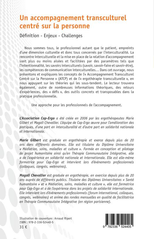 Nous sommes tous, le professionnel autant que le patient, empreints d’une dimension culturelle et donc tous concernés par l’interculturalité. La rencontre interculturelle et la mise en place de la relation d’accompagnement sont plus ou moins aisées et facilitées par des paramètres tels que l’intentionnalité, les savoirs interculturels (savoir, savoir-faire et savoir-être), les compétences de communication interculturelles… Dans cet ouvrage, nous présentons et expliquons les concepts de l’« Accompagnement Transculturel Centré sur la Personne » (ATCP) et de l’« ergothérapie transculturelle », en nous appuyant sur les théories qui les sous-tendent. Le lecteur trouvera également, outre de nombreuses informations théoriques, des retours d’expériences, des « défis », des outils concrets et transposables dans la pratique professionnelle.