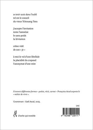 Un ailleurs dans l'ici, en entrant dans la poésie de Françoise Ascal nous avons le sentiment d'entrer à la fois dans la peinture chinoise classique, dans les poèmes de ses plus grands auteurs, comme si la sagesse qui en émane soulageait un peu de l'ici étroit, obscur, mystérieux, instable. Des poèmes de Françoise Ascal, Bernard Ascal, le compagnon de chaque jour disait : « travail-feu-de-bois, et à la fin il n’y a pas de cendres, mais un livre. »