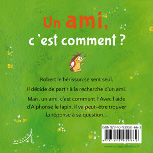 Robert le hérisson se sent seul. Il décide de partir à la recherche d´un ami. Mais, un ami, c´est comment ? Avec l´aide d´Alphonse le lapin, il va peut-être trouver la réponse à sa question...