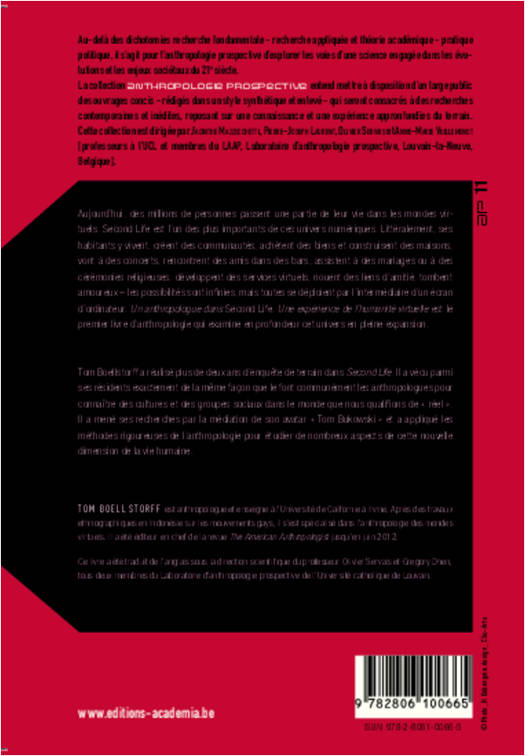Second Life est l'un des plus importants mondes virtuels actuels fréquentés par des millions de personnes. Tom Boellstorff y a réalisé plus de deux ans d'enquête de terrain. Il a vécu parmi ses résidents comme le font communément les anthropologues pour connaître des cultures et des groupes sociaux dans le monde que nous qualifions de "réel". Il a mené ses recherches par la médiation de son avatar "Tom Bukowski" pour étudier de nombreux aspects de cette nouvelle dimension de la vie humaine.