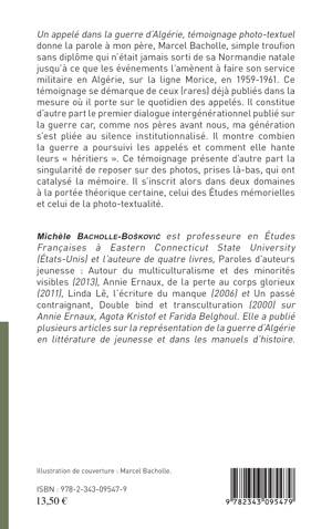 Ce livre donne la parole à mon père, Marcel Bacholle, simple troufion sans diplôme qui n'était jamais sorti de sa Normandie natale jusqu'à ce que les événements l'amènent à faire son service militaire en Algérie, sur la ligne Morice, en 1959-1961. Ce témoignage se démarque de ceux (rares) déjà publiés dans la mesure où il porte sur le quotidien des appelés. Il constitue d'autre part le premier dialogue intergénérationnel publié sur la guerre car, comme nos pères avant nous, ma génération s'est pliée au silence institutionnalisé. Il présente également la singularité de reposer sur des photos, prises là-bas, qui ont catalysé la mémoire.