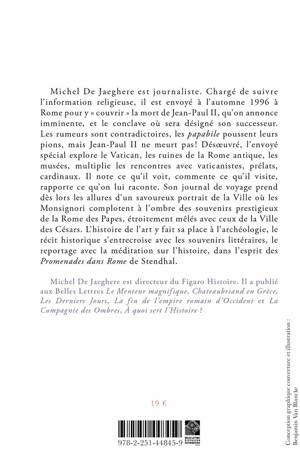 Michel De Jaeghere est journaliste. Charge de suivre l'information religieuse, il est envoye a l'automne 1996 a Rome pour y couvrir la mort de Jean-Paul II, qu'on annonce imminente, et le conclave ou sera designe son successeur. Les rumeurs sont contradictoires, les papabile poussent leurs pions, mais Jean-Paul II ne meurt pas ! Desoeuvre, l'envoye special explore le Vatican, les ruines de la Rome antique, les musees, multiplie les rencontres avec vaticanistes, prelats, cardinaux. Il note ce qu'il voit, commente ce qu'il visite, rapporte ce qu'on lui raconte. Son journal de voyage prend des lors les allures d'un savoureux portrait de la Ville ou les Monsignori complotent a l'ombre des souvenirs prestigieux de la Rome des Papes, etroitement meles avec ceux de la Ville des Cesars. L'histoire de l'art y fait sa place a l'archeologie, le recit historique s'entrecroise avec les souvenirs litteraires, le reportage avec la meditation sur l'histoire, dans l'esprit des Promenades dans Rome de Stendhal.