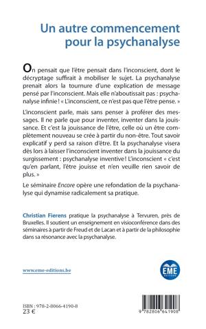 On pensait que l'être pensait dans l'inconscient, dont le décryptage suffirait à mobiliser le sujet. La psychanalyse prenait alors la tournure d'une explication de message pensé par l'inconscient. Mais elle n'aboutissait pas: psychanalyse infinie ! L'inconscient, ce n'est pas que l'être pense. Le séminaire Encore opère une refondation de la psychanalyse qui dynamise radicalement sa pratique.