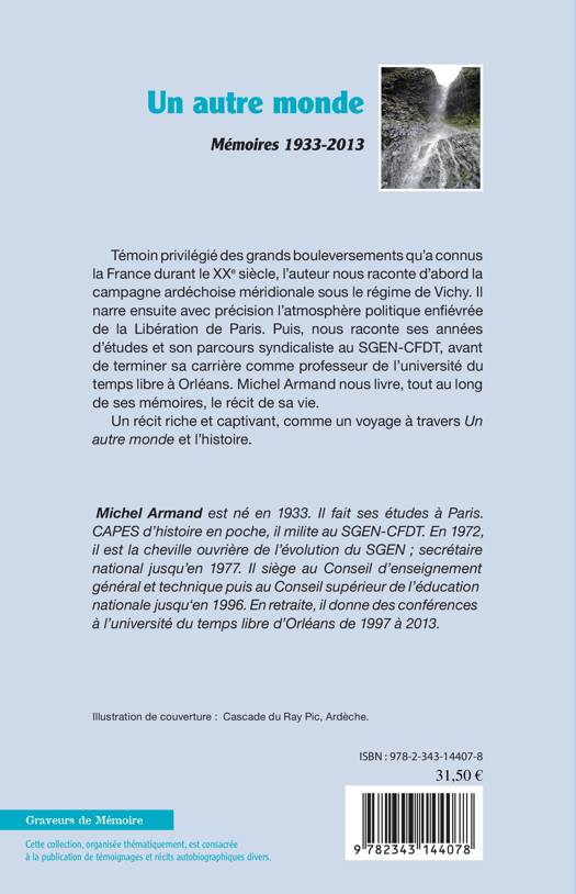 Témoin privilégié des grands bouleversements qu'à connus la France durant le XXe siècle, l'auteur nous livre, tout au long de ses mémoires, le récit de sa vie. En commençant par la campagne ardéchoise sous Vichy et la Libération de Paris. En passant par ses années d'études et son parcours syndicaliste au SGEN-CFDT, avant de terminer sa carrière comme professeur à l'université du temps libres à Orléans. Un récit riche et captivant, comme un voyage à travers Un autre monde et l'histoire.