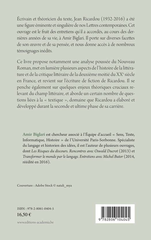 Ce livre est le fruit des entretiens que l'éminent écrivain et théoricien du texte, Jean Ricardou, a accordés à Amir Biglari. Il propose une analyse poussée du Nouveau Roman, met en lumière plusieurs aspects de l'histoire de la littérature et de la critique littéraire, et revient sur l'écriture de fiction de Ricardou. Il se penche également sur quelques enjeux théoriques cruciaux relevant du champ littéraire, et aborde un certain nombre de questions liées à la « textique ».