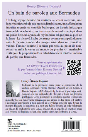 Une poésie puissante : un long voyage débridé du mutisme au chant souverain, une logorrhée funambule aux propos déstabilisants, un baratin initiatique irrecevable et salutaire, un inventaire de non-dits repiqué dans un pense-bête : Le silence à l’aube des temps comme un appel à donner suite la pensée tombée des nuages saisie dans un recueil de vannes, l’amour comme il n’existe pas vécu au point de non-retour et enfin la venue au monde du premier cri intarissable voilà pour la proposition d’un rafraîchissement d’idées, un bain de paroles aux Bermudes.