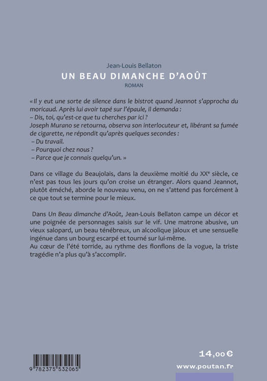 Dans Un Beau dimanche d’Août, Jean-Louis Bellaton campe un décor et une poignée de personnages saisis sur le vif. Une matrone abusive, un vieux salopard, un beau ténébreux, un alcoolique jaloux et une sensuelle ingénue dans un bourg escarpé et tourné sur lui-même. Au cœur de l’été torride, au rythme des flonflons de la vogue, la triste tragédie n’a plus qu’à s’accomplir...