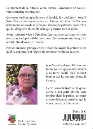 Le moment de la retraite venu, Patrice Cazabonne né sous x, veut connaître ses origines. Quelques indices, glanés avec difficulté, le conduisent jusqu’à Saint-Maurice-la-Souterraine, en Creuse où sans révéler aux habitants la raison de sa présence, il mène de patientes recherches qui lui désignent (bientôt) celle qui pourrait être sa mère. Ayant toujours vécu à Sarcelles, (en banlieue parisienne), chez ses parents adoptifs, il découvre avec étonnement une vie qui lui semble être d’un autre monde. Patrice enquête, partagé entre le désir de savoir, la crainte de ce qu’il va apprendre et l’espoir de retrouver enfin ses racines.