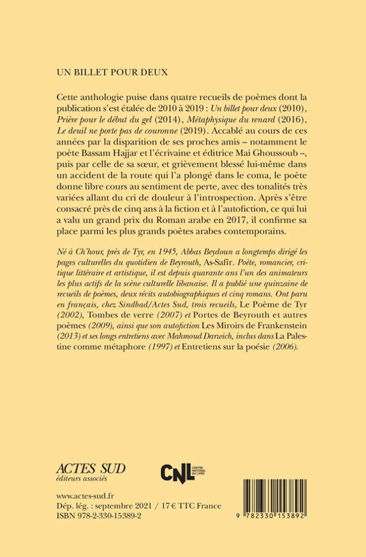 Cette anthologie puise dans quatre recueils de poèmes dont la publication s'est étalée de 2010 à 2019 : Un billet pour deux (2010), Prière pour le début du gel (2014), Métaphysique du renard (2016), Le deuil ne porte pas de couronne (2019). Accablé au cours de ces années par la disparition de ses proches amis - notamment le poète Bassam Hajjar et l'écrivaine et éditrice Mai Ghoussoub -, puis par celle de sa soeur, et grièvement blessé lui-même dans un accident de la route qui l'a plongé dans le coma, le poète donne libre cours au sentiment de perte, avec des tonalités très variées allant du cri de douleur à l'introspection. Après s'être consacré près de cinq ans à la fiction et à l'autofiction, ce qui lui a valu un grand prix du Roman arabe en 2017, il confirme sa place parmi les plus grands poètes arabes contemporains.