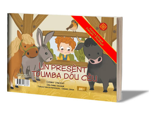 Dans un petit village du Sud de la France, un cheval, un âne, un taureau et un oiseau découvrent dans leur enclos un étrange paquet qui semble tombé du ciel. Que vont faire nos amis ? Bien curieux, ils se rapprochent de l’étrange objet... Voici un conte qui parle de partage et de générosité avec une pointe de curiosité ! Version LIVRE COUVERTURE SOUPLE format A5 BILINGUE en Tête-Bêche : Français / Provençal (traduction Gabriel Brun) Avec un petit explicatif pour la prononciation du provençal