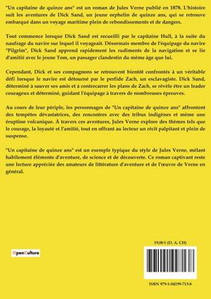 "Un capitaine de quinze ans" est un roman de Jules Verne publié en 1878. L'histoire suit les aventures de Dick Sand, un jeune orphelin de quinze ans, qui se retrouve embarqué dans un voyage maritime plein de rebondissements et de dangers.