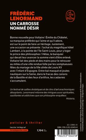 Bonne nouvelle pour Voltaire ! Émilie du Châtelet, sa marquise préférée qui l’aime et qu’il adore, est sur le point de faire un héritage. Justement, une occasion se présente : l’achat du magnifique hôtel Lambert, à la pointe de l’île Saint-Louis, pour y loger le prince des philosophes ! Hélas, le banquier qui devait leur avancer la somme vient d’être enlevé.