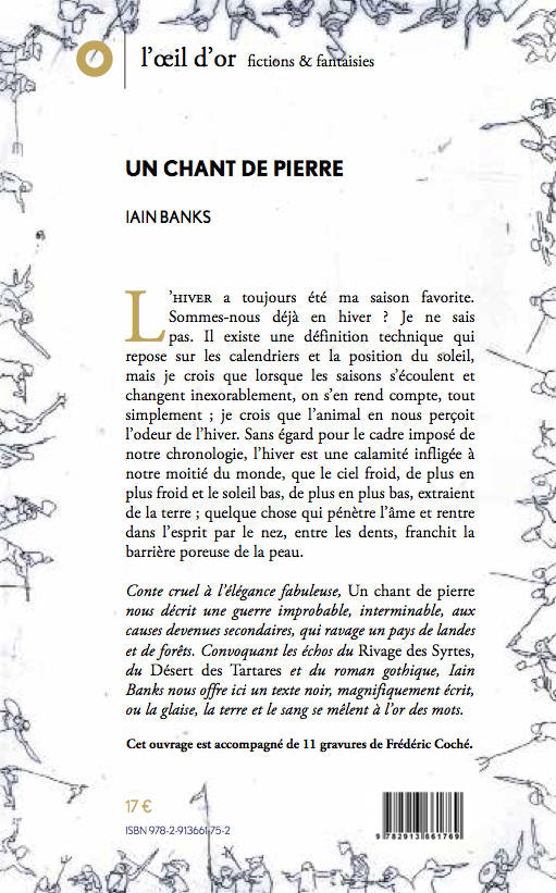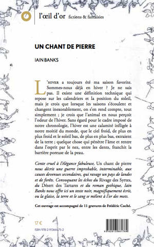 Conte cruel à l'élégance fabuleuse, Un chant de pierre nous décrit une guerre improbable, interminable, aux causes devenues secondaires, qui ravage un pays de landes et de forêts. Convoquant les échos du Rivage des Syrtes, du Désert des Tartares et du roman gothique, Iain Banks nous offre ici un texte noir, magnifiquement écrit, ou la glaise, la terre et le sang se mêlent à l'or des mots.