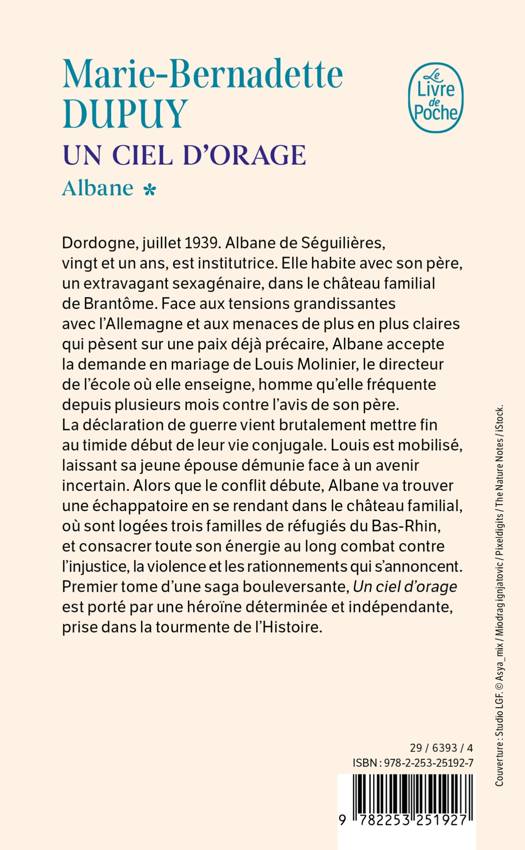 Dordogne, juillet 1939. Albane de Séguilières, vingt et un ans, est institutrice. Elle habite avec son père, un extravagant sexagénaire, dans le château familial de Brantôme. Face aux tensions grandissantes avec l’Allemagne et aux menaces de plus en plus claires qui pèsent sur une paix déjà précaire, Albane accepte la demande en mariage de Louis Molinier, le directeur de l’école où elle enseigne et qu’elle fréquente depuis plusieurs mois contre l’avis de son père. La déclaration de guerre vient brutalement mettre fin au timide début de leur vie conjugale. Louis est mobilisé, laissant sa jeune épouse démunie face à un avenir incertain. Alors que le conflit débute, Albane va trouver une échappatoire au château familial, où sont logées trois familles de réfugiés du Bas-Rhin, et consacrer toute son énergie au long combat contre l’injustice, la violence et les rationnements qui s’annoncent.