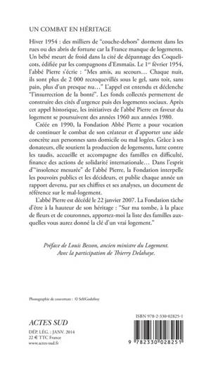 Créée en 1990, la Fondation Abbé Pierre a pour vocation de continuer le combat de son créateur et d'apporter une aide concrète aux personnes sans domicile ou mal logées. Grâce à ses donateurs, elle soutient la production de logements, lutte contre les taudis, accueille et accompagne des familles en difficulté, finance des actions de solidarité internationale... Dans l'esprit d'"insolence mesurée" de l'abbé Pierre, la Fondation interpelle les pouvoirs publics et les décideurs, et publie chaque année un rapport devenu, par ses chiffres et ses analyses, un document de référence sur le mal- logement.