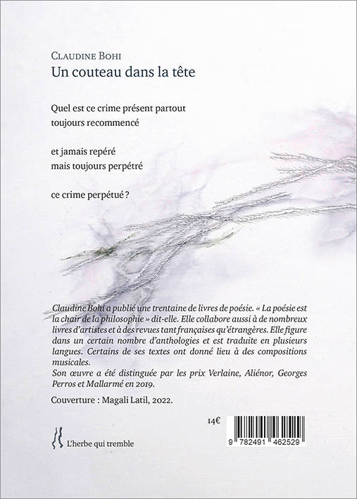 « On est jamais délivré des choses tant qu’elles ne sont pas livrées aux autres », disait Guillevic. Ainsi, Claudine Bohi écrit en 4e de couverture, pour nous faire entrer dans son poème :