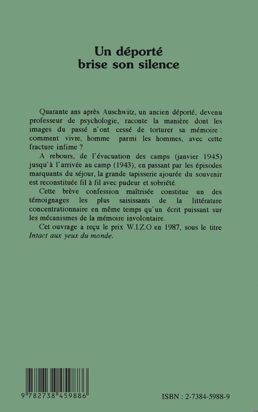 Quarante ans après Auschwitz, un ancien déporté, devenu professeur de psychologie, raconte la manière dont les images du passé n'ont cessé de torturer sa mémoire : comment vivre, homme parmi les hommes, avec cette fracture infime ? Cette brève confession maîtrisée constitue un des témoignages les plus saisissants de la littérature concentrationnaire en même temps qu'un écrit puissant sur les mécanismes de la mémoire involontaire. Cet ouvrage a reçu le prix W.I.ZO en 1987 sous le titre Intact aux yeux du monde.