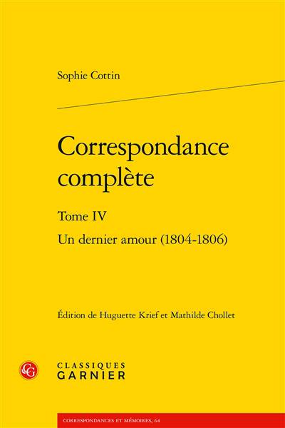 Les lettres inédites de Sophie Cottin et du philosophe pyrénéen Azaïs, issues des manuscrits de la Bibliothèque historique de la Ville de Paris, ruinent les légendes forgées sur ce couple mythique. Les 370 lettres du quatrième tome, Un dernier amour (1804-1806), de la Correspondance complète, révèlent que la romancière, loin d'être une Ariane abandonnée, rêve d'un amour partagé, impose à son amant la voie d'un « éros céleste » et prend l'initiative de leur rupture. Fascinée par la théorie des compensations d'Azaïs, elle y trouve un sens à la vie. Or, malgré le succès de Mathilde ou mémoires tirés de l'histoire des croisades (1805) et l'amitié du poète Michaud, elle suit avec une infinie mélancolie la marche inexorable de l'Histoire sous Napoléon.