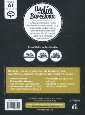 Andrea es músico y esta noche tiene un concierto muy importante en Barcelona, pero su instrumento ha desaparecido. Conseguir otro va a ser toda una aventura. Un día en. es una colección de lecturas para divertirse y conocer ciudades del mundo hispano. Historias cortas Diccionarios visuales para entender el vocabulario Información cultural de cada lugar (gastronomía, historia.) Actividades para practicar la lengua Glosarios en inglés, francés, alemán y neerlandés