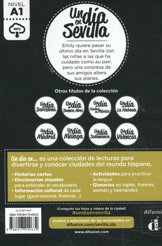 Lectura graduada de nivel A1 ambientada en la ciudad de Sevilla vista en 24 horas de aventura trepidante. Intriga, amor, cultura, gastronomía, información turística y actualidad. Incluye notas culturales en forma de artículos o pequeños reportajes. Contiene numerosas actividades para trabajar el léxico y glosarios en varios idiomas.