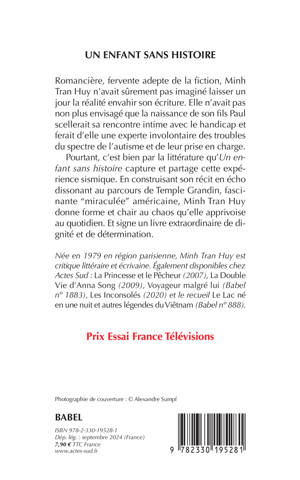 Romancière, fervente adepte de la fiction, Minh Tran Huy n'avait sûrement pas imaginé laisser un jour la réalité envahir son écriture. Elle n'avait pas non plus envisagé que la naissance de son fils Paul scellerait sa rencontre intime avec le handicap et ferait d'elle une experte involontaire des troubles du spectre de l'autisme et de leur prise en charge. Pourtant, c'est bien par la littérature qu'"Un enfant sans histoire" capture et partage cette expérience sismique. En construisant son récit en écho dissonant au parcours de Temple Grandin, fascinante "miraculée" américaine, Minh Tran Huy donne forme et chair au chaos qu'elle apprivoise au quotidien. Et signe un livre extraordinaire de dignité et de détermination.