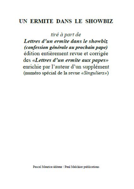 Tiré à part de "Lettres d’un ermite dans le showbiz : confession générale au prochain pape" (édition entièrement revue et corrigée des «Lettres d’un ermite aux papes» enrichie par l’auteur d’un supplément - numéro spécial de la revue «Singuliers») : où l'on retrouve André Comte-Sponville, Christine Boutin, Nicole Croisille, Raymond Devos, Sophie Marceau, Georges Moustaki, Nicoletta, Line Renaud, Didier Sandre, Georges Wilson... et beaucoup d'autres.
