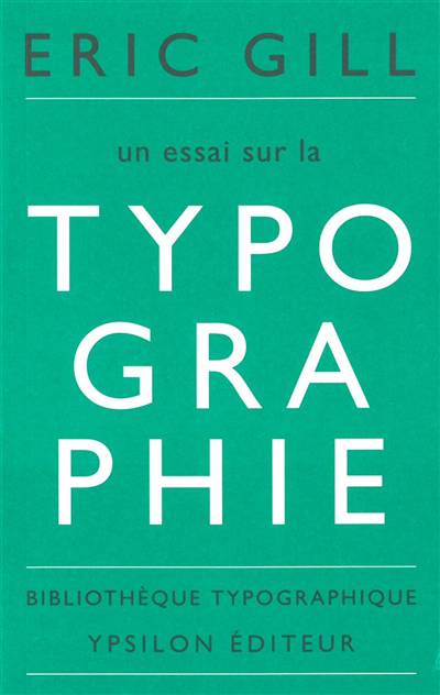 An Essay on Typography, publié en 1931 puis en 1936 dans une seconde édition révisée et augmentée, est l’ouvrage le plus connu de Gill. Il y étudie les méthodes de création et de production de la typographie : les formes des lettres, mais également la composition textuelle. Cet essai est continûment étayé par une réflexion sur les relations entre le travail manuel de l’homme, sa dimension créative, et sa mécanisation progressive et inéluctable, ainsi que sur les contradictions qu’elles ne manquent pas d’engendrer.
