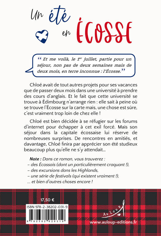 « Et me voilà, le 1er juillet, partie pour un séjour, non pas de deux semaines mais de deux mois, en terre inconnue : l’Écosse. » <br /><br /> Chloé avait de tout autres projets pour ses vacances que de passer deux mois dans une université à prendre des cours d’anglais. Et le fait que cette université se trouve à Édimbourg n’arrange rien : elle sait à peine où se trouve l’Écosse sur la carte mais, une chose est sûre, c’est vraiment trop loin de chez elle !<br /> Chloé est bien décidée à se réfugier sur les forums d’internet pour échapper à cet exil forcé. Mais son séjour dans la capitale écossaise lui réserve de nombreuses surprises. De rencontres en amitiés, et davantage, Chloé finira par apprécier son été studieux beaucoup plus qu’elle ne s’y attendait...<br /><br /> Note : Dans ce roman, vous trouverez :<br /> –â¯des Écossais (dont un particulièrement craquant !), <br /> –â¯des excursions dans les Highlands,<br /> –â¯une série de festivals (qui existent vraiment !),<br /> ... et bien d’autres choses encore !