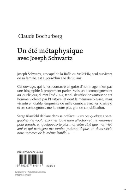 Joseph Schwartz, rescapé de la Rafle du Vel'd'Hiv, seul survivant de sa famille, est aujourd'hui âgé de 98 ans. Cet ouvrage, qui lui est consacré en guise d'hommage, n'est pas une biographie à proprement parler. Mais un accompagnement au jour le jour, durant l'été 2024, tendu de réflexions autour de cet homme violenté par l'Histoire, et dont la mémoire blessée, mais vivante en diable, empreinte de mille combats avec les Klarsfeld et ses compagnons, mérite notre plus grande considération.