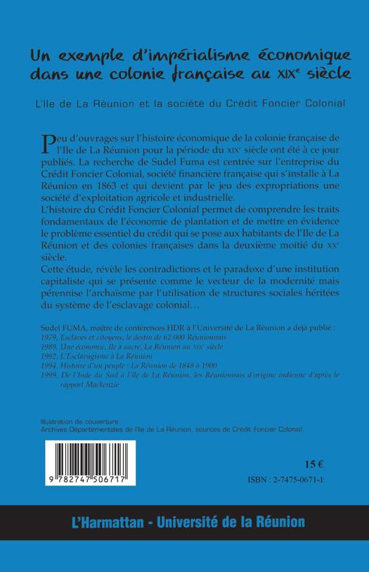 Le Crédit Foncier Colonial, société financière française, s'installe à La Réunion en 1863 et devient une société d'exploitation agricole et industrielle. L'histoire du Crédit Foncier Colonial permet de comprendre les traits fondamentaux de l'économie de plantation et de mettre en évidence le problème essentiel du crédit à La Réunion. Elle révèle le paradoxe d'une institution capitaliste qui se présente comme le vecteur de la modernité mais pérennise l'archaïsme par l'utilisation de structures sociales héritées du système de l'esclavage colonial