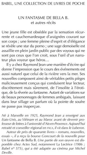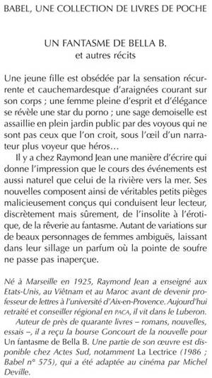 Une jeune fille est obsédée par la sensation récurrente et cauchemardesque d'araignées courant sur son corps ; une femme pleine d'esprit et d'élégance se révèle une star du porno ; une sage demoiselle est assaillie en plein jardin public par des voyous qui ne sont pas ceux que l'on croit, sous l'oeil d'un narrateur plus voyeur que héros... Il y a chez Raymond Jean une manière d'écrire qui donne l'impression que le cours des événements est aussi naturel que celui de la rivière vers la mer. Ses nouvelles composent ainsi de véritables petits pièges malicieusement conçus qui conduisent leur lecteur, discrètement mais sûrement, de l'insolite à l'érotique, de la rêverie au fantasme. Autant de variations sur de beaux personnages de femmes ambiguës, laissant dans leur sillage un parfum où la pointe de soufre ne passe pas inaperçue. «Né à Marseille en 1925, Raymond Jean a enseigné aux Etats-Unis, au Viêtnam et au Maroc avant de devenir professeur de lettres à l'université d'Aix-en-Provence.Aujourd'hui retraité et conseiller régional en PACA, il vit dans le Luberon. Auteur de près de quarante livres - romans, nouvelles, essais -, il a reçu la bourse Goncourt de la nouvelle pour Un fantasme de Bella B. Une partie de son oeuvre est disponible chez Actes Sud, notamment La Lectrice (1986 ; Babel n° 575), qui a été adaptée au cinéma par Michel Deville.»