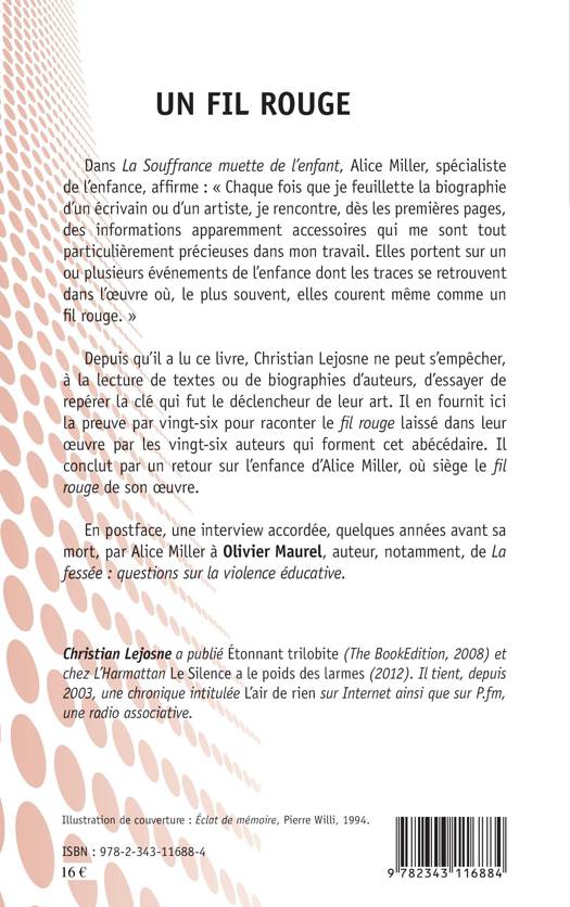 Depuis qu'il a lu La souffrance muette de l'enfant, d'Alice Miller, l'auteur de ce livre ne peut s'empêcher, à la lecture de textes ou de biographies d'auteurs, d'essayer de repérer la clé qui fut le déclencheur de leur art. Il utilise ici cette méthode, en se penchant sur les vingt-six auteurs (Capote, Kafka, Orwell, Zorn...) qui forment cet abécédaire. Il conclut par un retour sur l'enfance d'Alice Miller, où siège le fil rouge de son oeuvre.